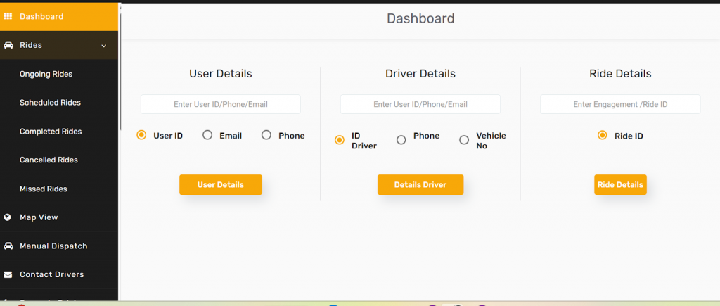 - Provides a complete overview of all rides — Ongoing, Scheduled, and Completed.